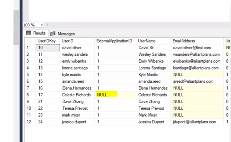 In SSMS we analyzed the User Data table and saw Null’s in the External Application ID for a few users.
