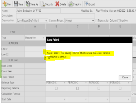 The error message "must declare scalar variable @columnheaderID” is a known bug and has already been fixed in our version 9.1 and higher.