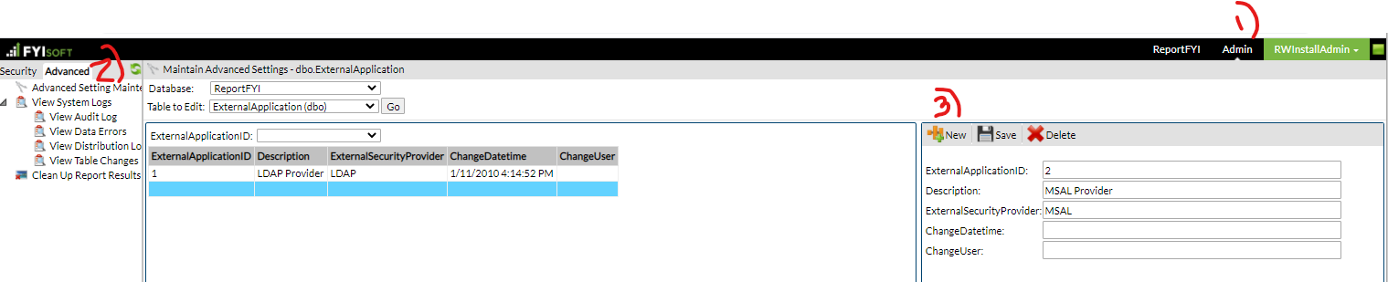 In ReportFYI, with the Renovo (rwinstall) user ID, navigate to Advanced Setting Maintenance and enter an ExternalApplication setting for MSAL.
