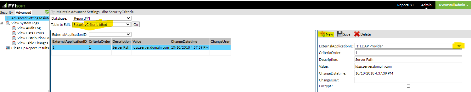 Choose SecurityCriteria from the Table to Edit Dropdown.